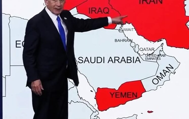 استعرض رئيس الوزراء الإسرائيلي بنيامين نتنياهو خريطة للشرق الأوسط، حدّد خلالها خصوم بلاده باللون الأحمر، في إشارة إلى ما وصفه بمحور تقوده إيران ويضم عدة أطراف إقليمية.